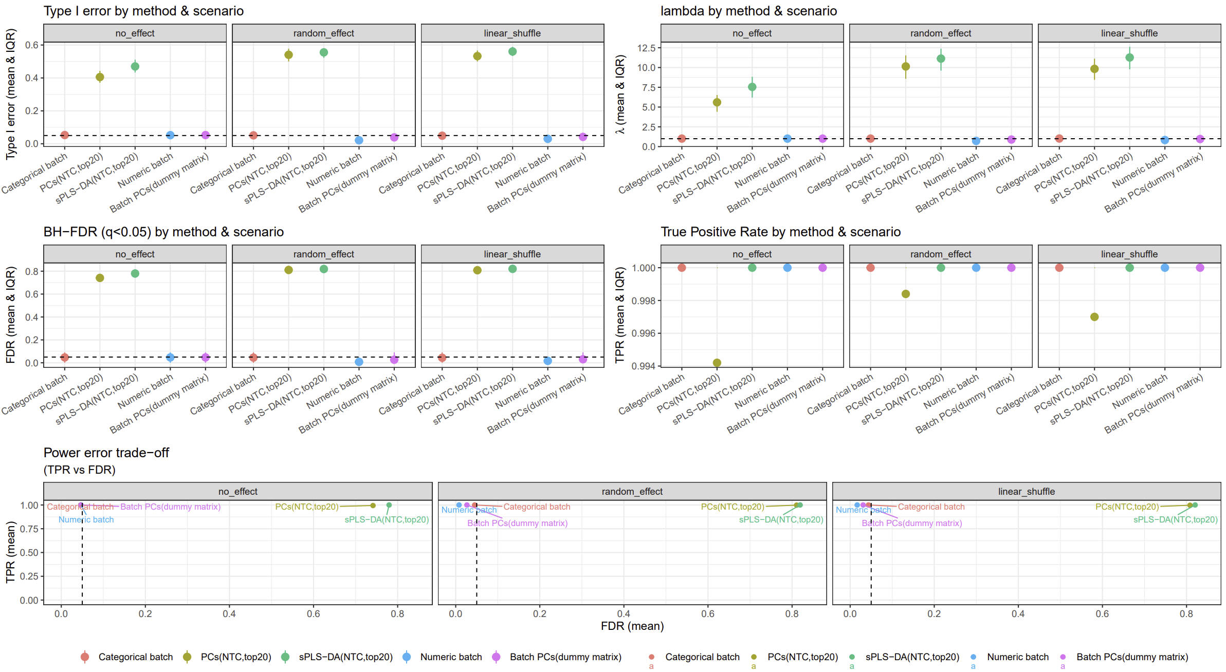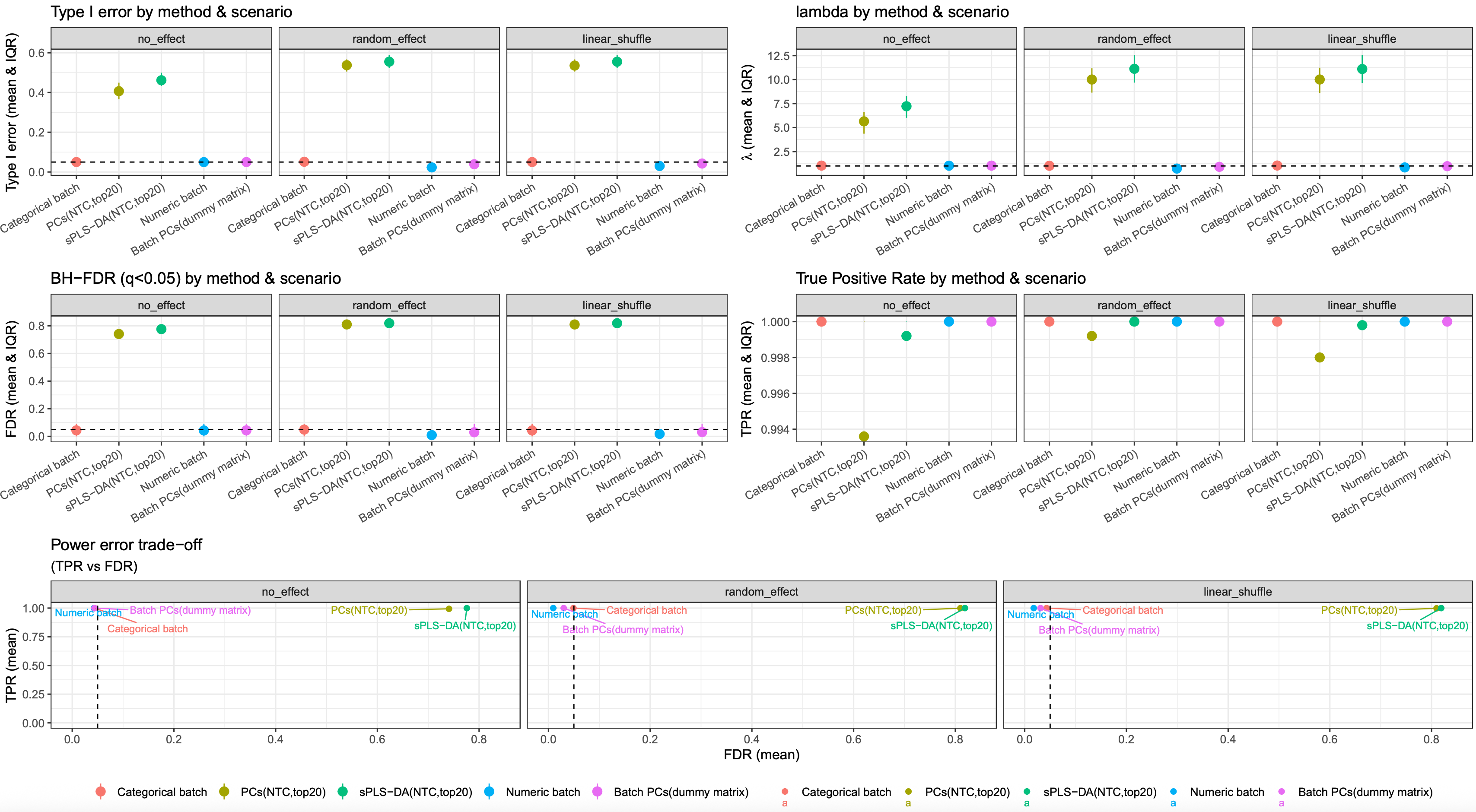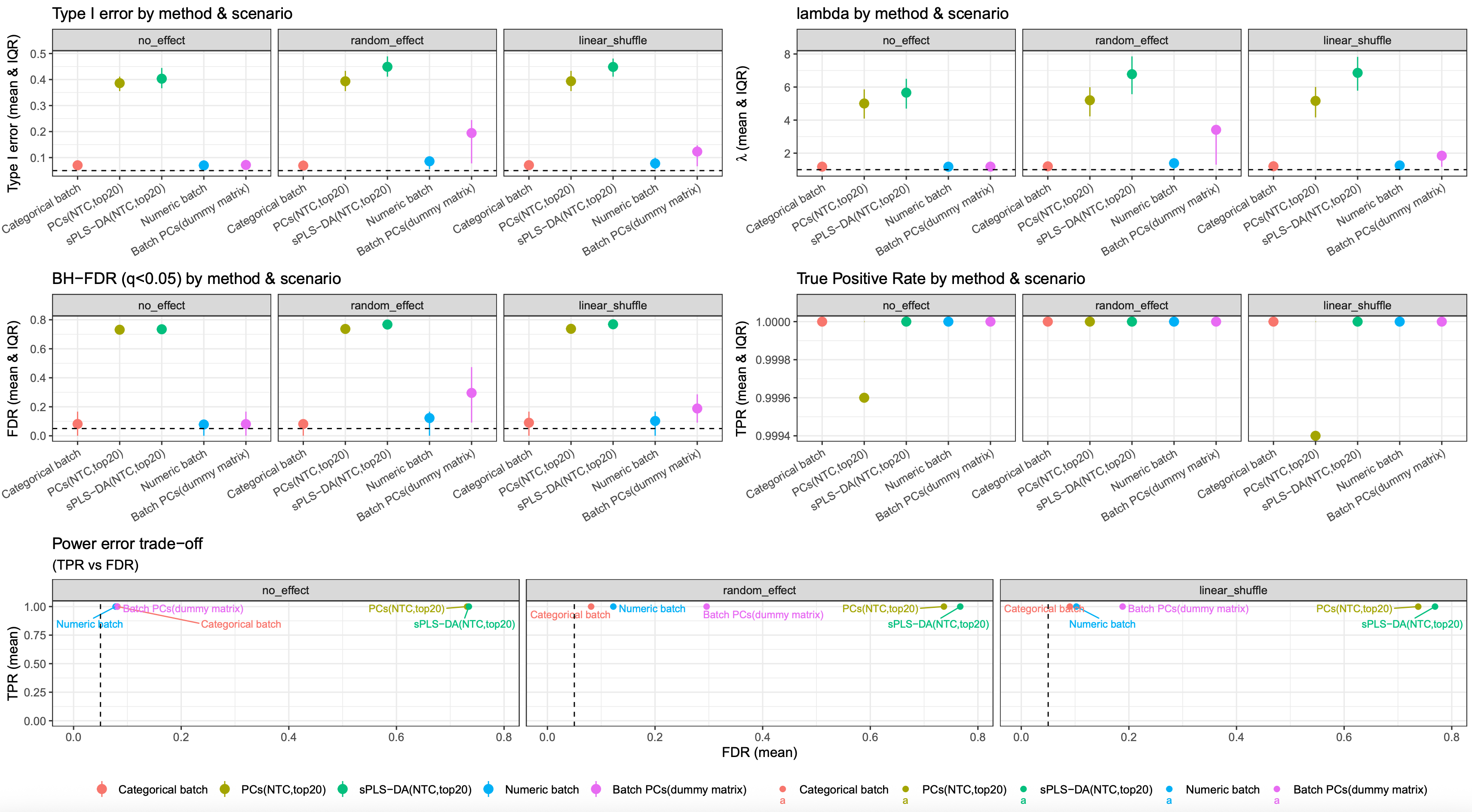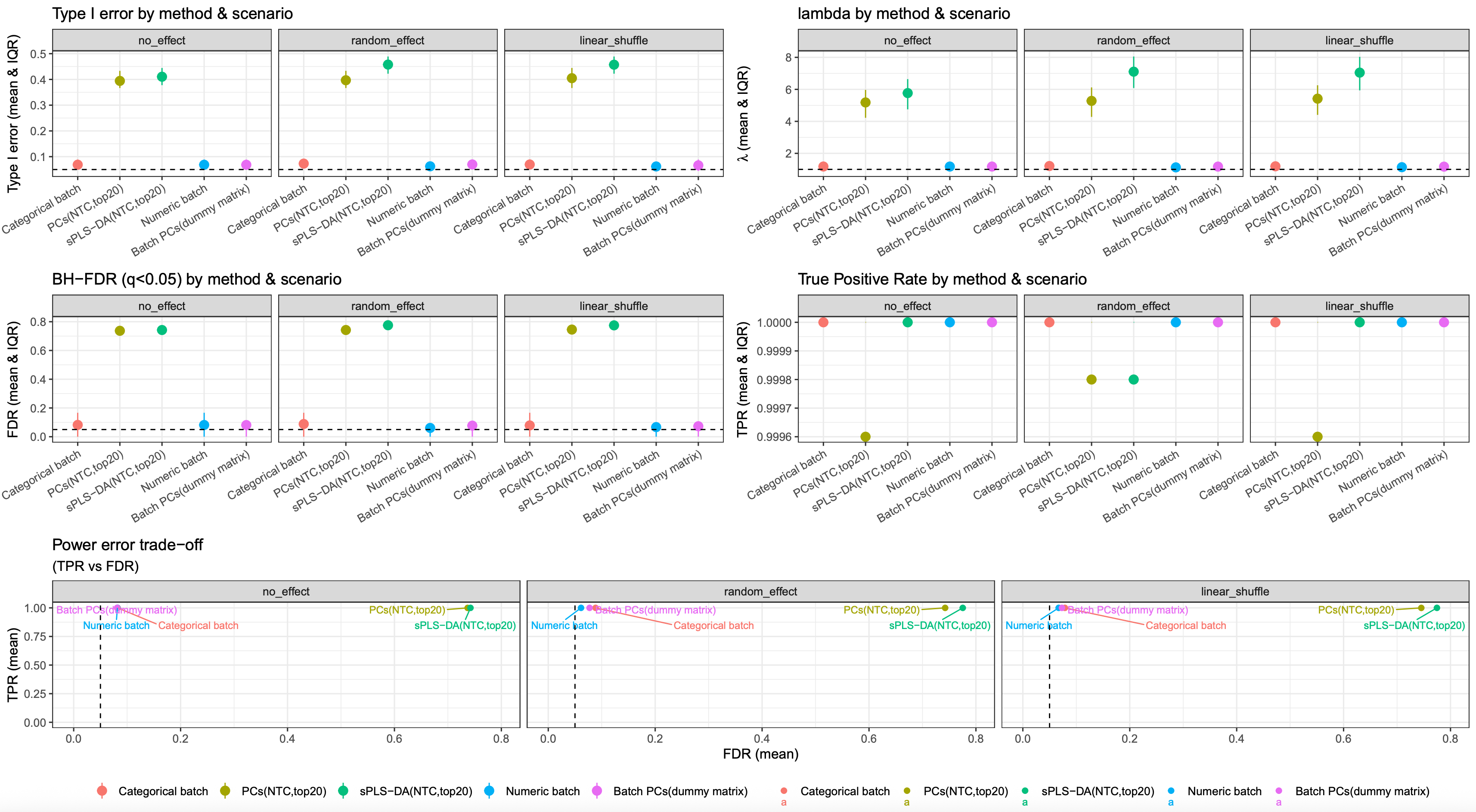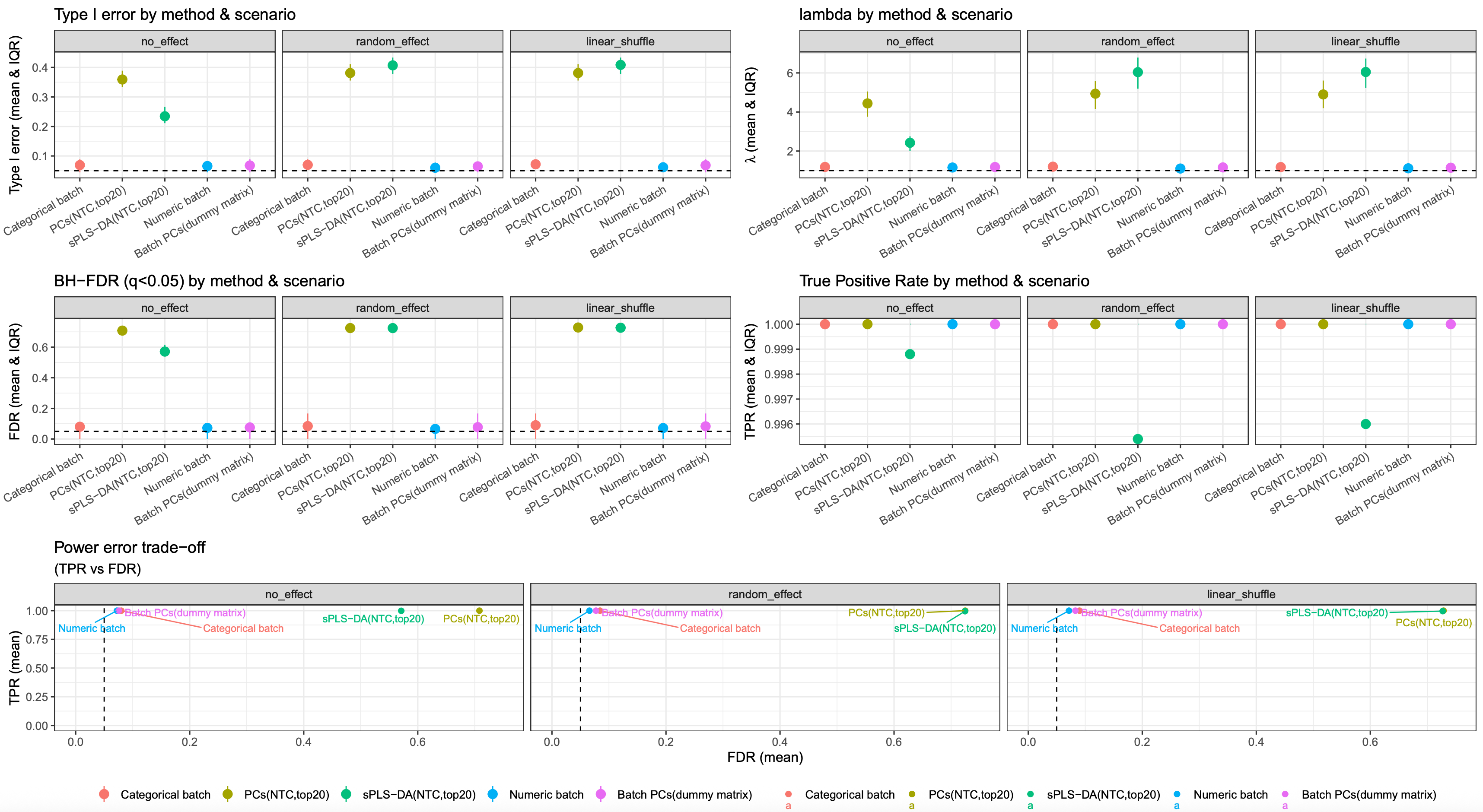 The 500 simulations indicate that representing batch as categorical, numeric, or via a dummy matrix based on batch PCs leads to similar results. Compared to other two results based on latent batch factor methods (PCA and PLS-DA), they all showed reduced type I error and FDR, with an almost 100% true positive rate (TPR)